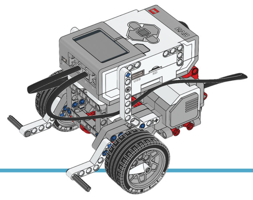 Robot má dva motory – každý pohání jedno kolo. Pokud se ale podíváte pozorněji, zjistíte, že oproti obrázku je robot vybaven několika dalšími senzory: